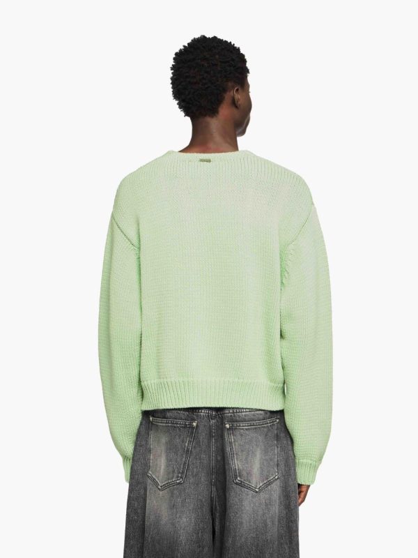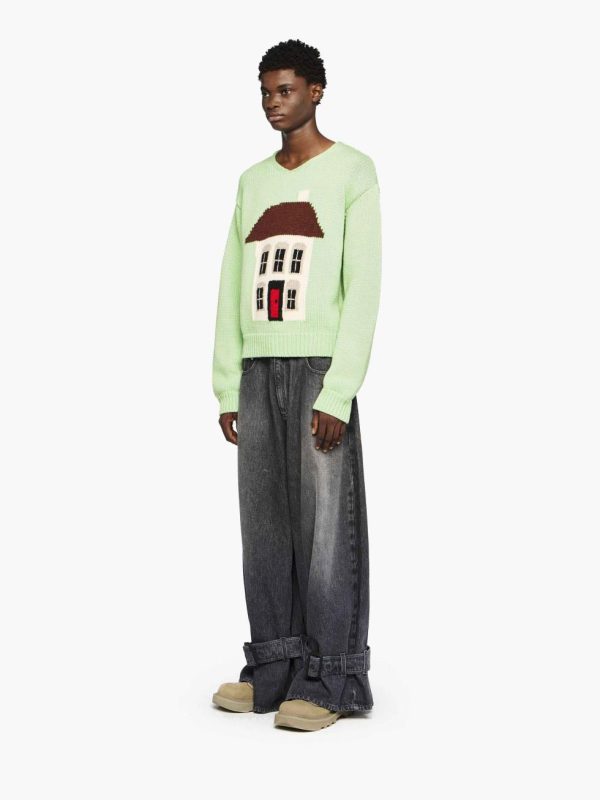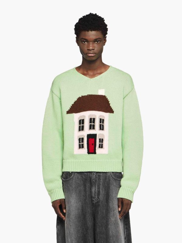 - Knitted sweater with shrunken silhouette, complete with intarsia “house” motif