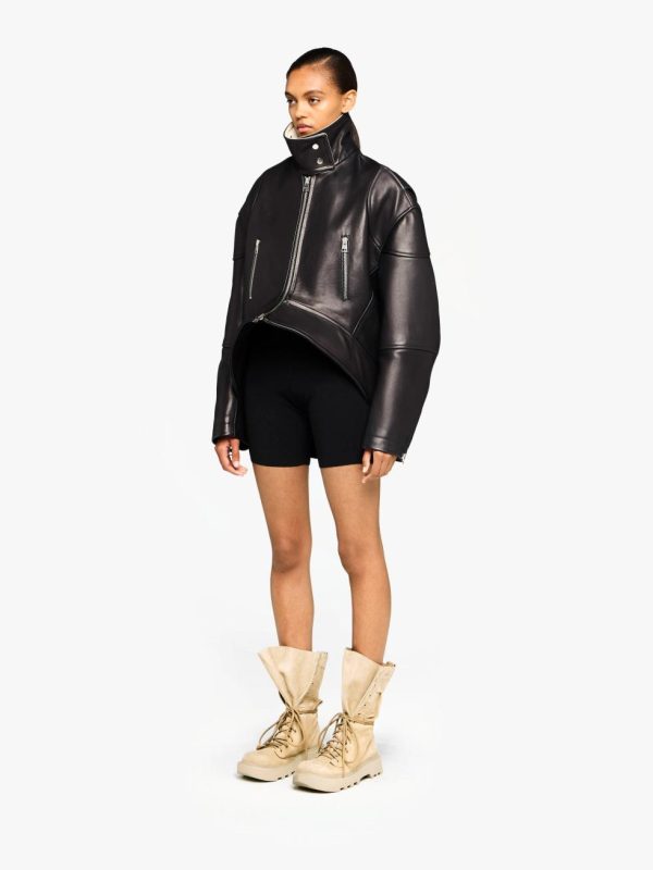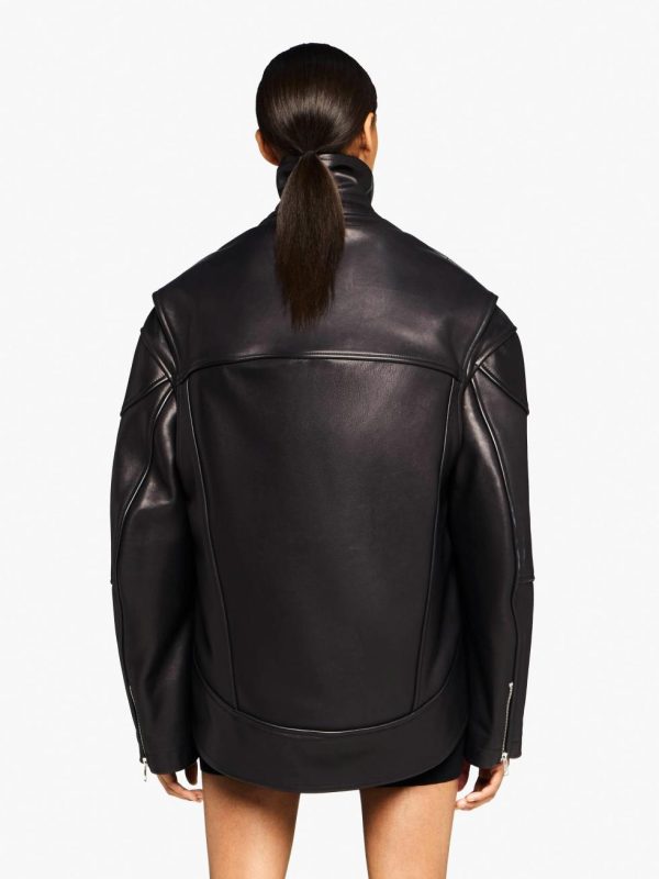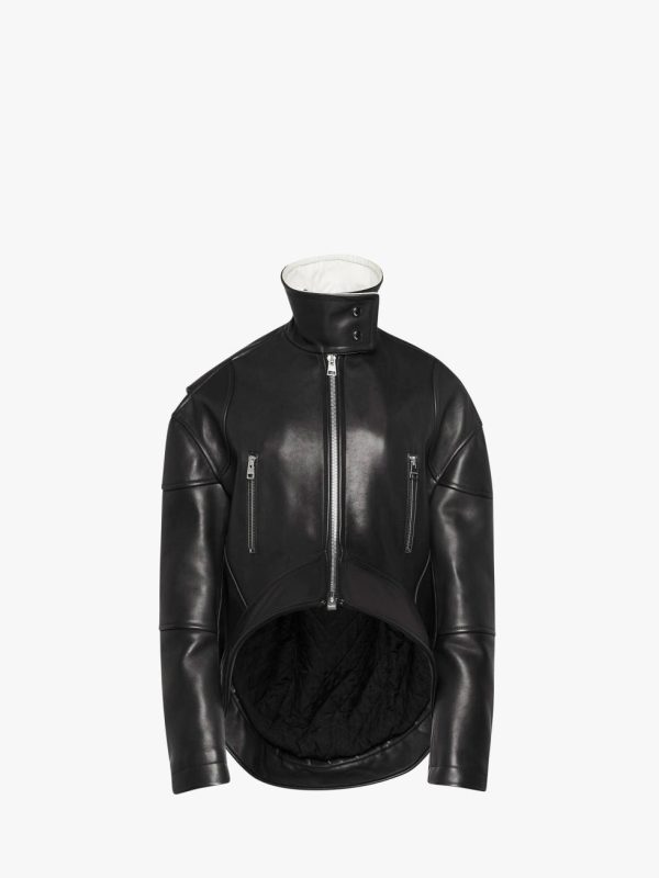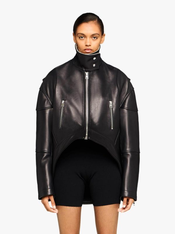 - Zip-front leather jacket, complete with curved asymmetric hemline