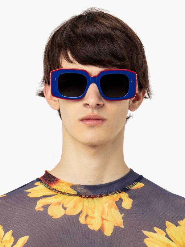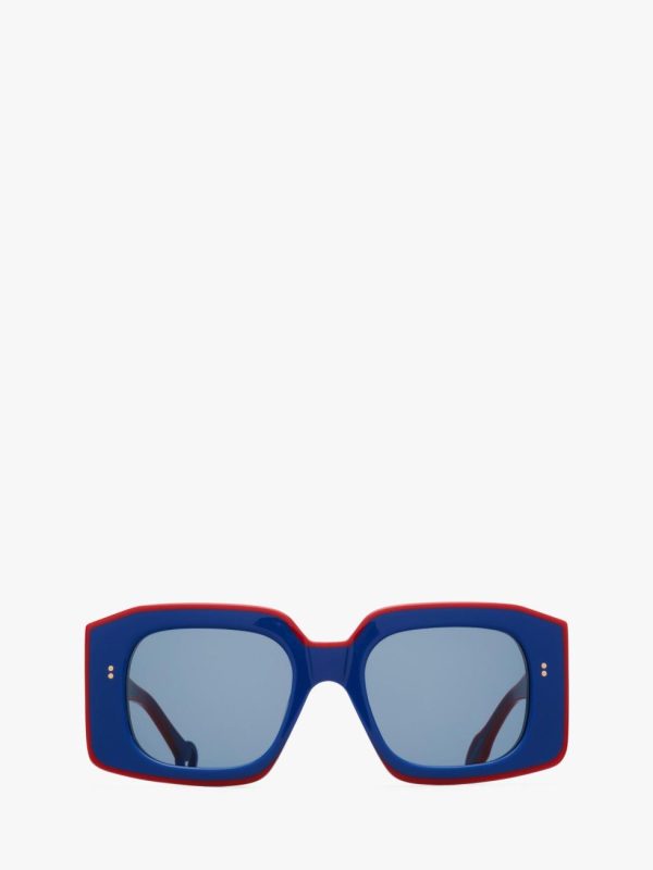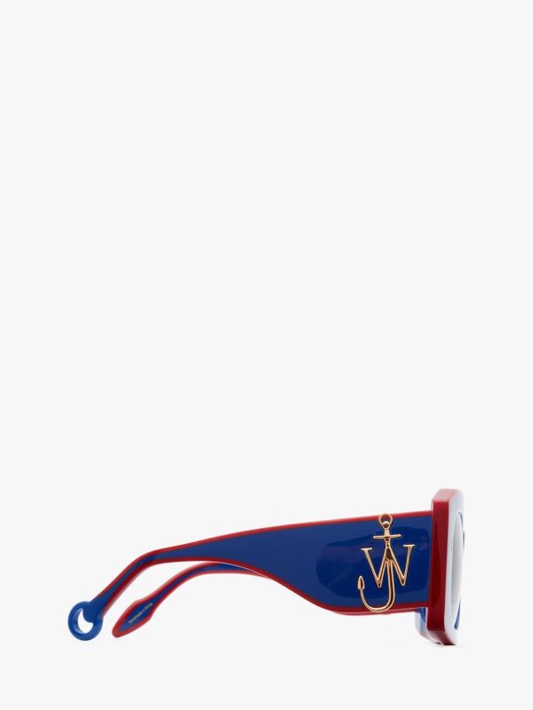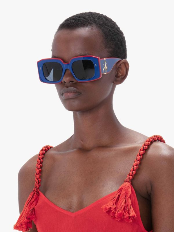 - umper-frame Sunglasses, complete with abstract shaped lenses, and contrasting colour-blocked edging.